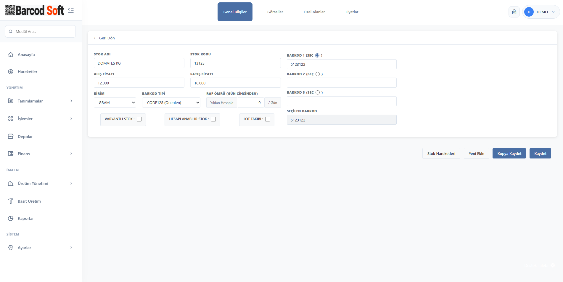 - Üretim modülü: