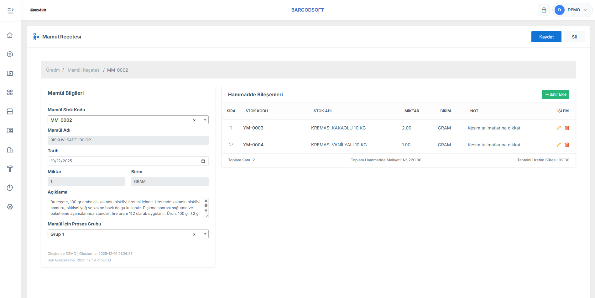 Birebir üretim ekranı sayesinde lot bazlı giriş ve çıkışlar net ve kontrollü şekilde takip edilir.