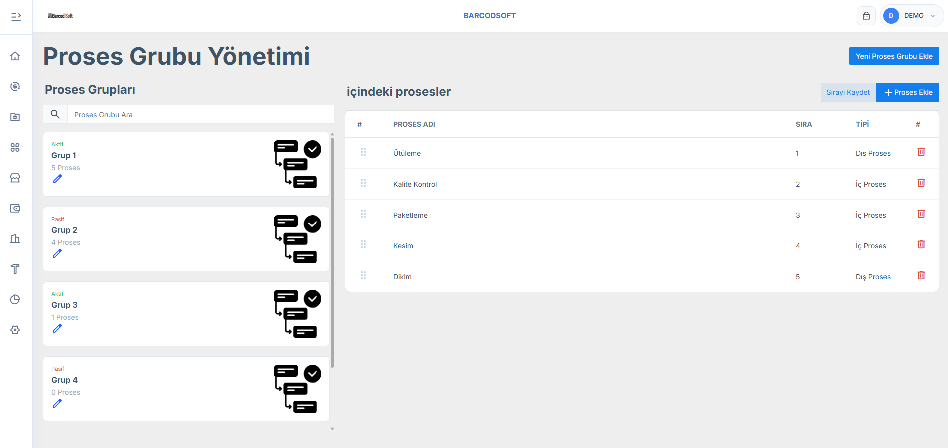Reçete, proses, proses grupları ve iş emirleri ile üretim süreçlerini uçtan uca yönetmeyi sağlar.